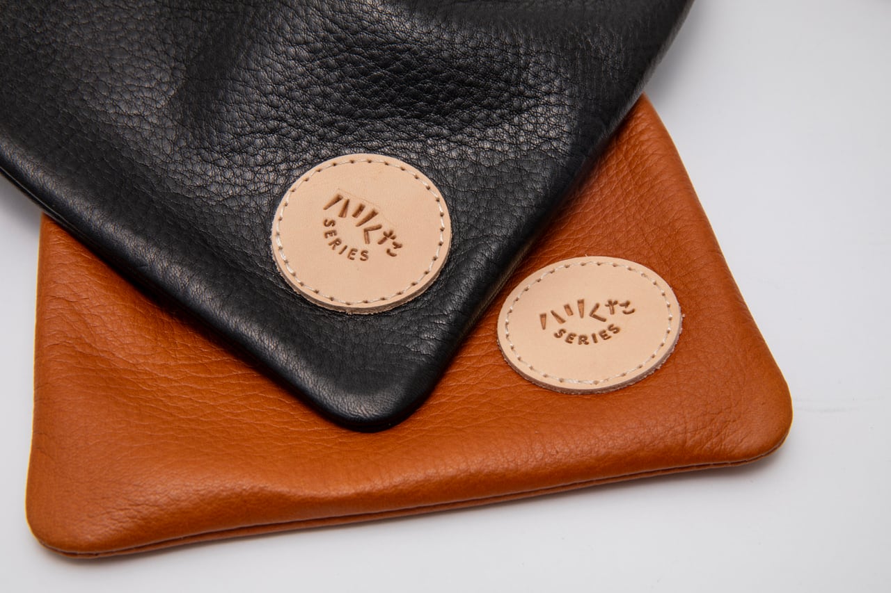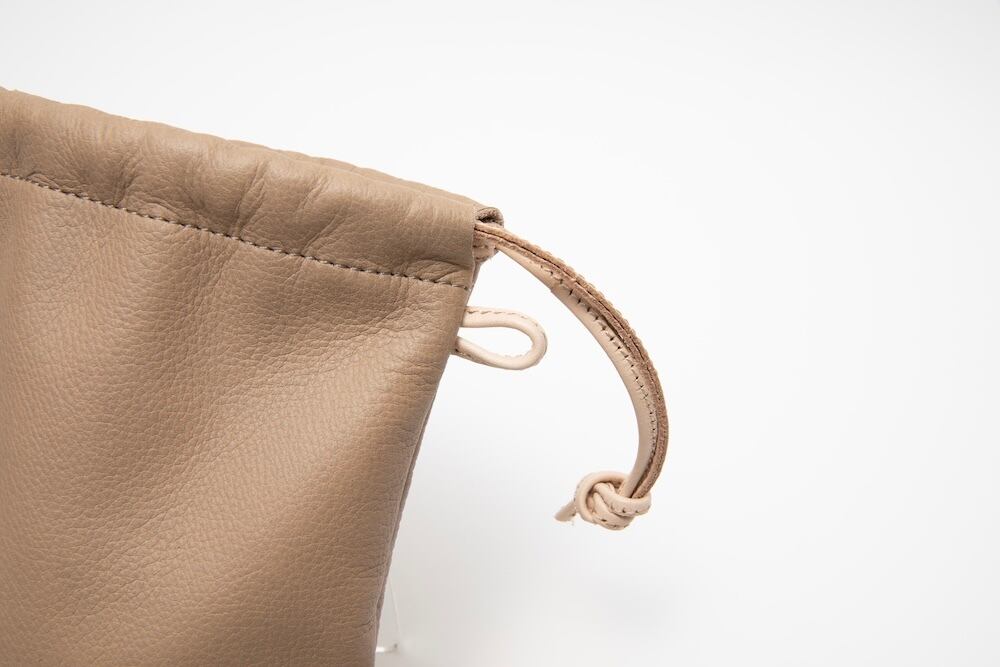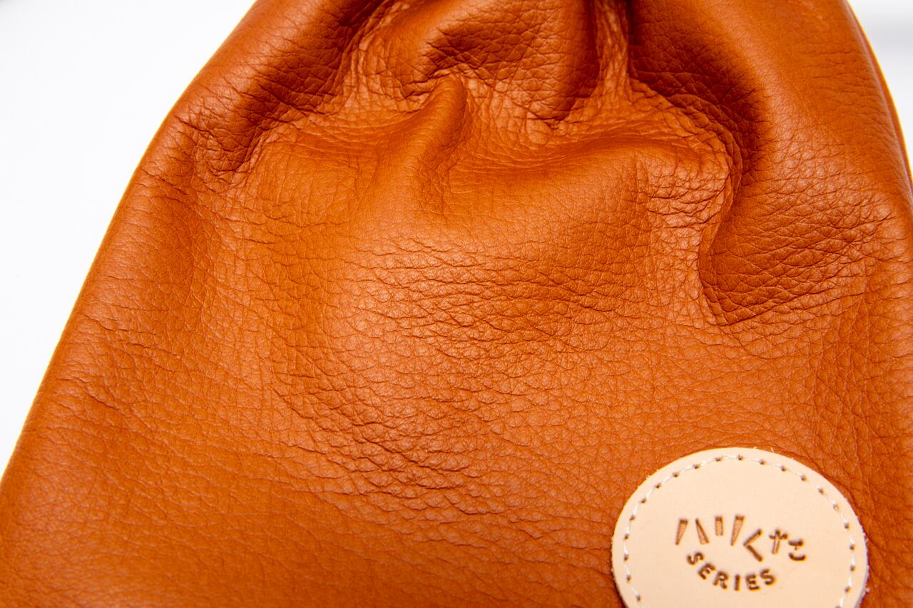 しなやかで柔らかなウォッシャブルレザーは、使い込むほどに身体に馴染み、独自の風合いが生まれます。巾着の紐には高品質なヌメ革を使用。ハリくたのロゴにはヌメ革のさりげないワンポイントが施されており、アクセントとして光ります。
